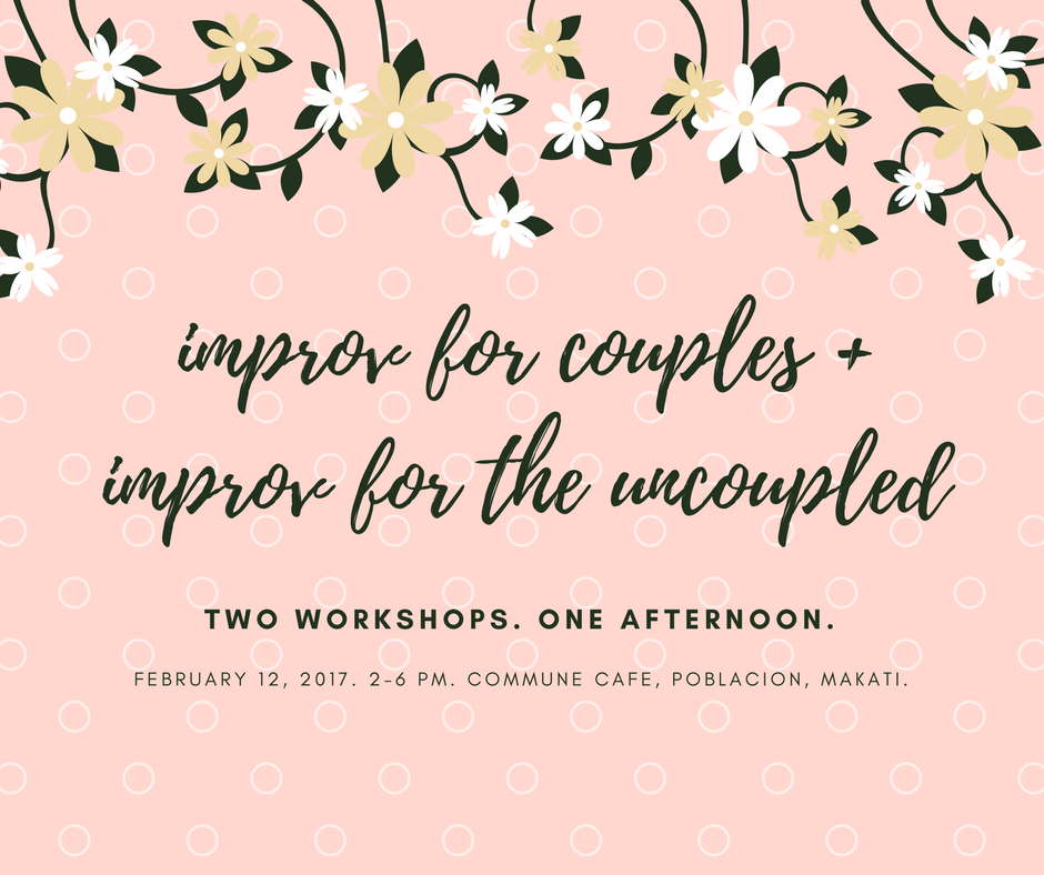 IMPROV FOR COUPLES is a three-hour improv workshop and jam for couples who have always wanted to try improv with their significant others. All couples are welcome – same sex or straight, married for decades or just starting out or aren’t really defined because the man is lazy and malabo – as long as you love each other, you’re welcome to join us. 🙂