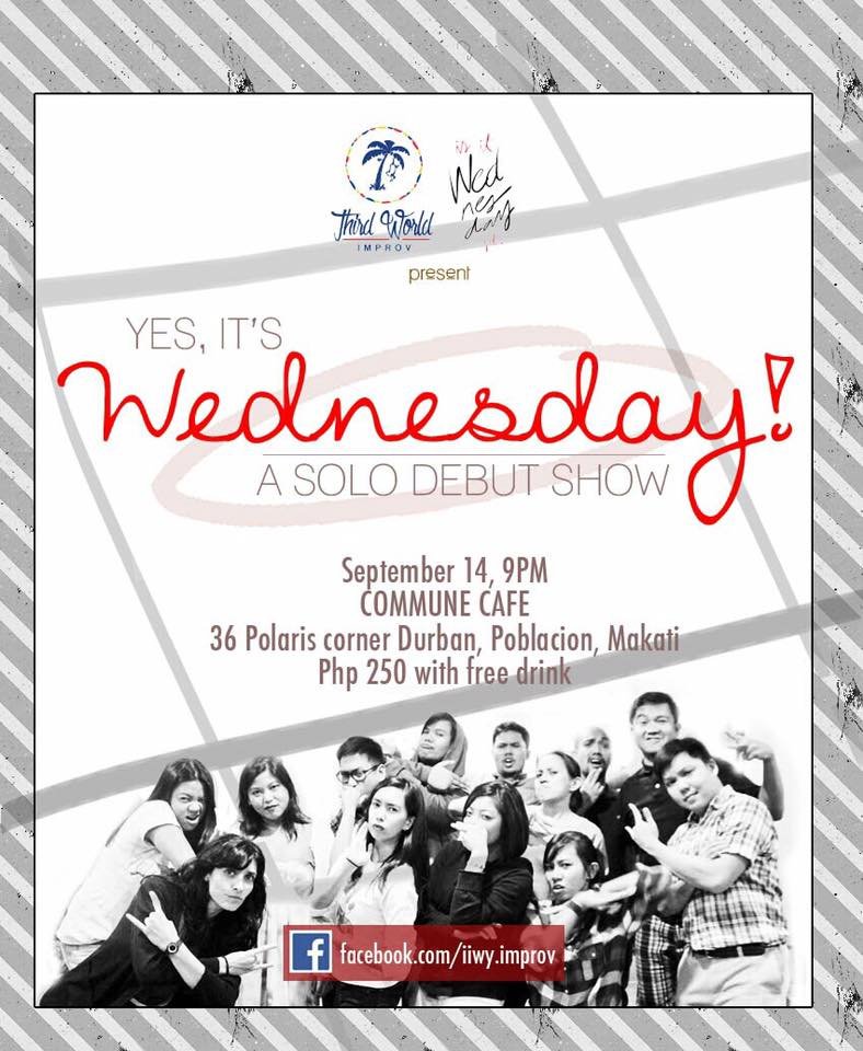 Because we had so much fun with SPIT and #ThirdWorldImprov last Thursday, we’re doing another improv night tomorrow! Improv group Is It Wednesday Yet? is finally performing their first ever solo show… on a Wednesday!