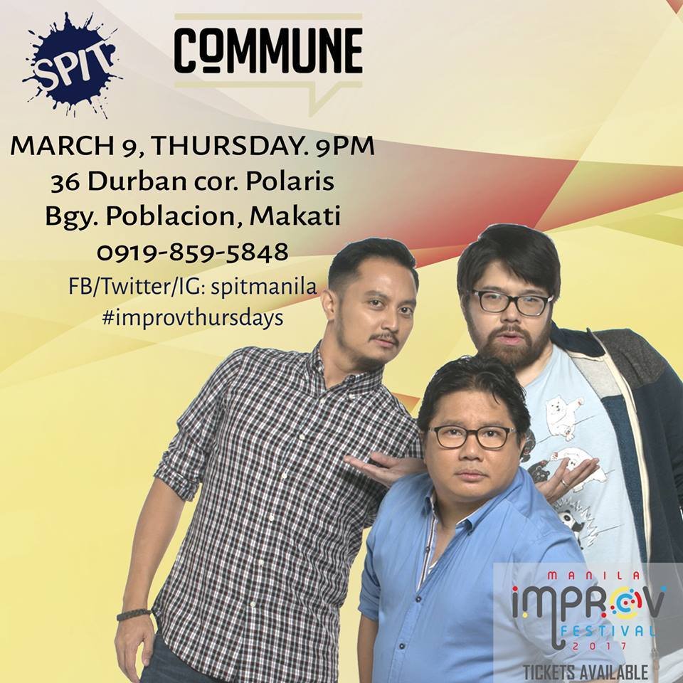 Thursday is improv day! Plus, #manilaimprovfest tickets will be on sale! Catch @spitmanila, 9pm at Commune. Call or text 0919 859 5848 to reserve your seats. #CommunePH #improvthursdays