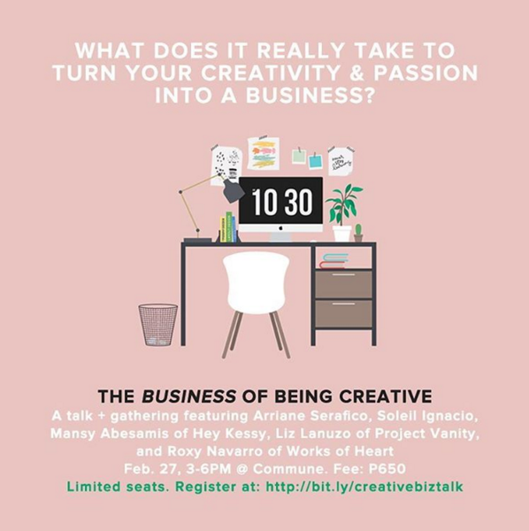 What does it really take to turn your creativity & passion into a business? The Business of Being Creative. A talk + gathering featuring Arriane Serafico, Soleil Ignacio, Mansy Abesamis of Hey Kessy, Liz Lanuzo of Project Vanity, and Roxy Navarro of Works of Heart. Limited seats. Register at http://bit.ly/creativebiztalk